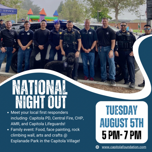 Join Capitola Police Department and partner agencies for free food and activities, hosted this year in Esplanade Park. This is a great opportunity to get to know your first responders and City staff.