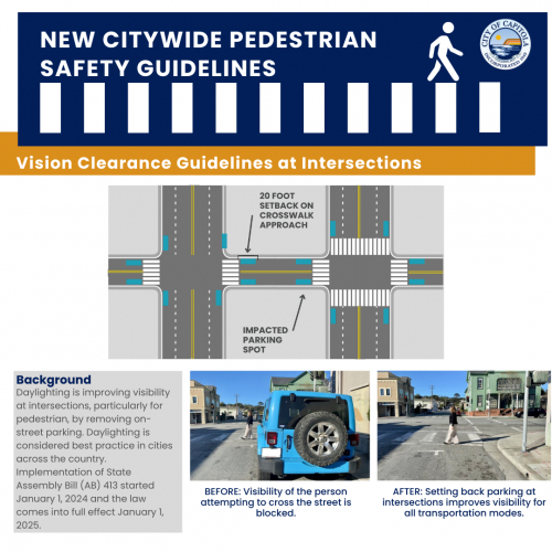 Daylighting is a safety concept aimed at improving visibility near crosswalks by removing parked cars and other obstructions. The goal is to keep the area adjacent to crosswalks clear, allowing drivers to see pedestrians who are using or about to enter the crosswalk. This traffic safety measure is part of the City's ongoing commitment to enhance the safety of both residents and visitors in Capitola.