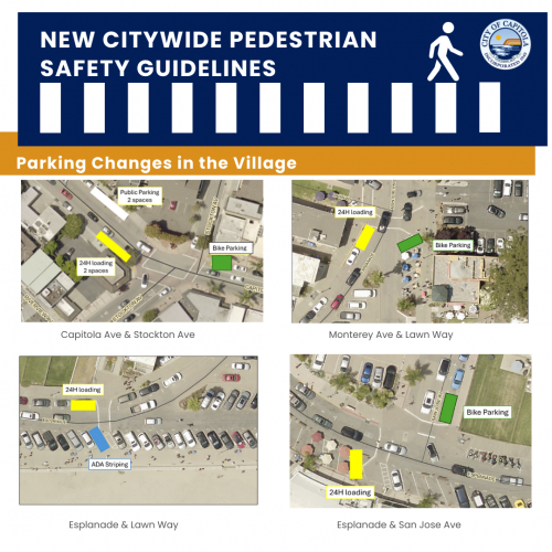 The City of Capitola will be modifying parking in the Village to comply with AB 413 and will designate some daylighting areas for public bike parking. According to AB 413, it is illegal to park within 20 feet of a crosswalk, regardless of whether the curb is painted red. Locations to be painted red will include mid-block crossings and areas in commercial zones, parks, and schools.