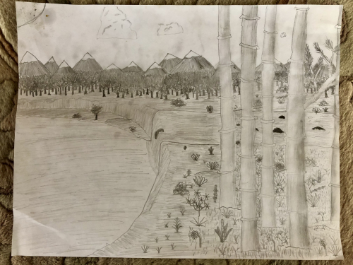 I did the bamboo because I thought that I was good at drawing bamboo and the forest was a divider between the bamboo and the mountains and the lake just fit in.