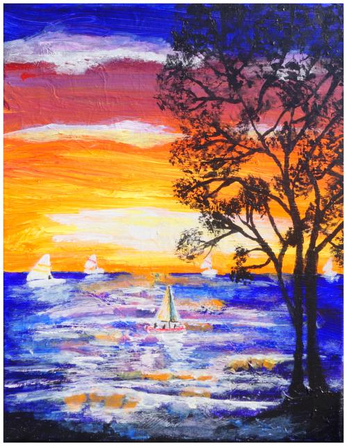It was a warm summer evening when I caught these sailboats on the ocean just as the sun was setting. Sunsets are usually very bright and I love the vibrant colors of the sun set and the white sailboats. This painting is done on a Painted Wrapped Stretched canvas with Acrylic Paints, this means you don't need a frame, just a nail to hang it.
