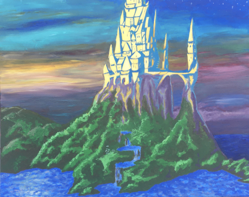 Gabriel has been creating art through different modalities all his life. He started painting Acrylic on canvas in 2020 and his subject matter of castles represents how our homes have become our safe haven during these troubling times. This is his first acrylic painting measuring 24 by 30.
